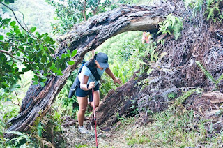 My wife and I ran to a fenceline and followed it through an overgrown and eventually climbed under the H3. There were a few stream crossings and then we reached a steep part with some ropes to aid in us climbing. We eventually reached a dirt road and to my surprise we started hearing voices and then finally saw some faces of the people in our group. Everyone seemed pretty surprised to see us. We quickly appologized for getting lost and for being late but everything was swiftly forgiven and off we went up Halawa ridge.